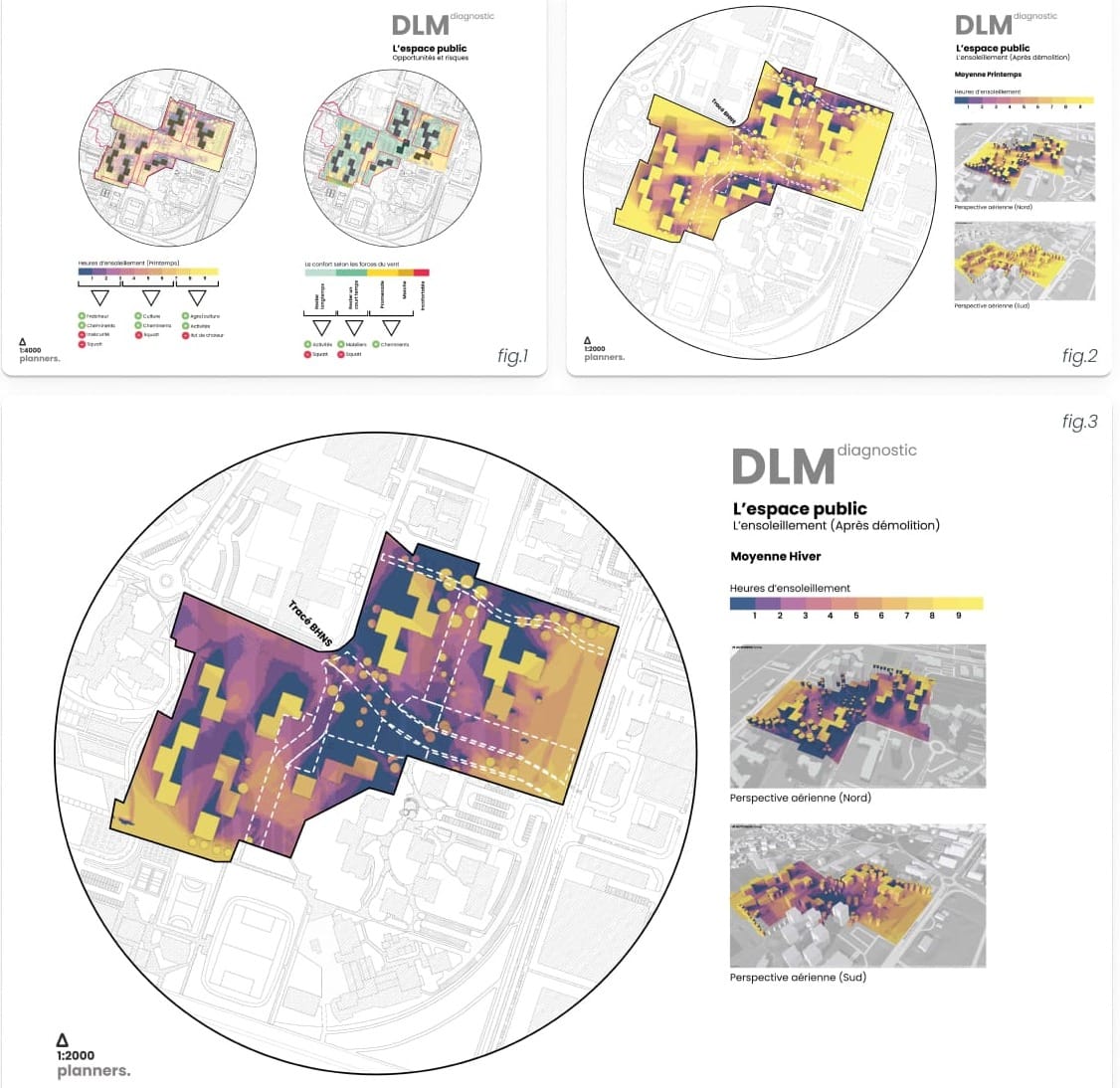 Pour répondre aux attentes de la maîtrise d’ouvrage sur les enjeux climatiques, nous avons eu recours à des simulations environnementales : analyse des vents dominants, des îlots de chaleur urbains, de l’ensoleillement et du confort dans les logements, mais aussi du rôle de la végétation dans les échanges de CO₂. Ces simulations orientent le plan guide :